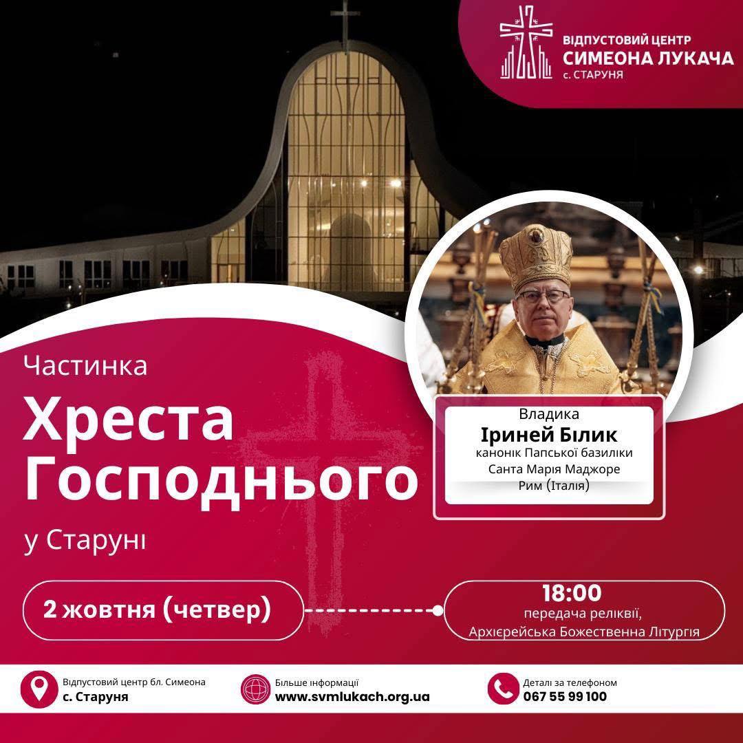 У четвер, 2 жовтня, до Відпустового центру блаженного священномученика Симеона, що в с. Старуня, завітає владика Іриней Білик – єпископ-емерит, канонік Папської базиліки Санта Марія Маджоре (Рим, Італія). Архиєрей приїде,...