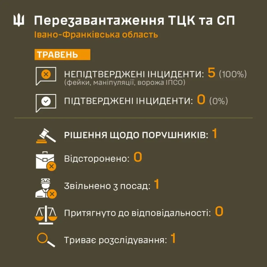 Івано-Франківський ОТЦК та СП запевняє, що у травні продовжив системну роботу з фіксації та аналізу усіх інцидентів щодо діяльності представників територіальних центрів комплектування та соціальної підтримки.